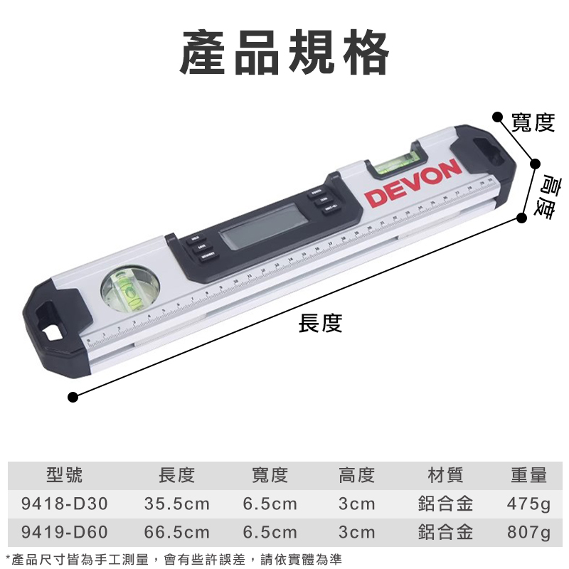 大有 DEVON|9418 / 9419電子水平尺(30cm/60cm)