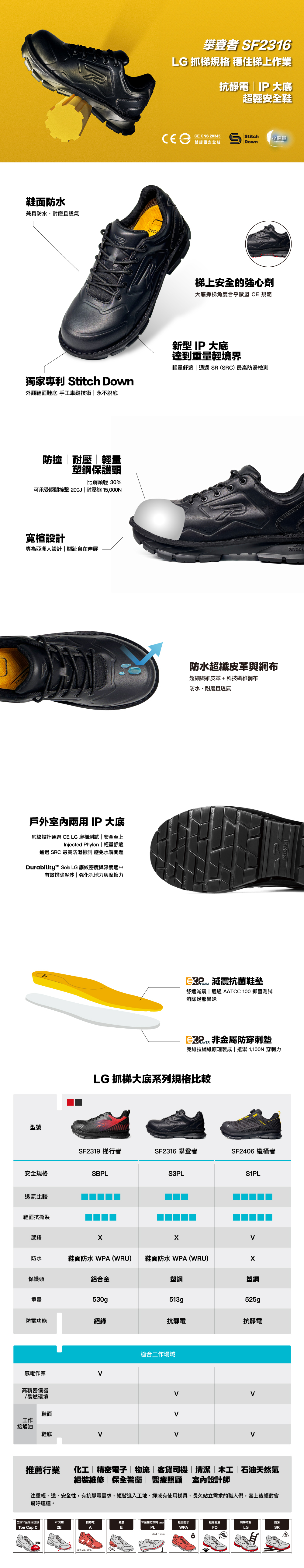 鞋底耐油 FO ∣ 鞋面防水 WPA(WRU) ∣ 抓梯 LG ∣ 抗靜電 A