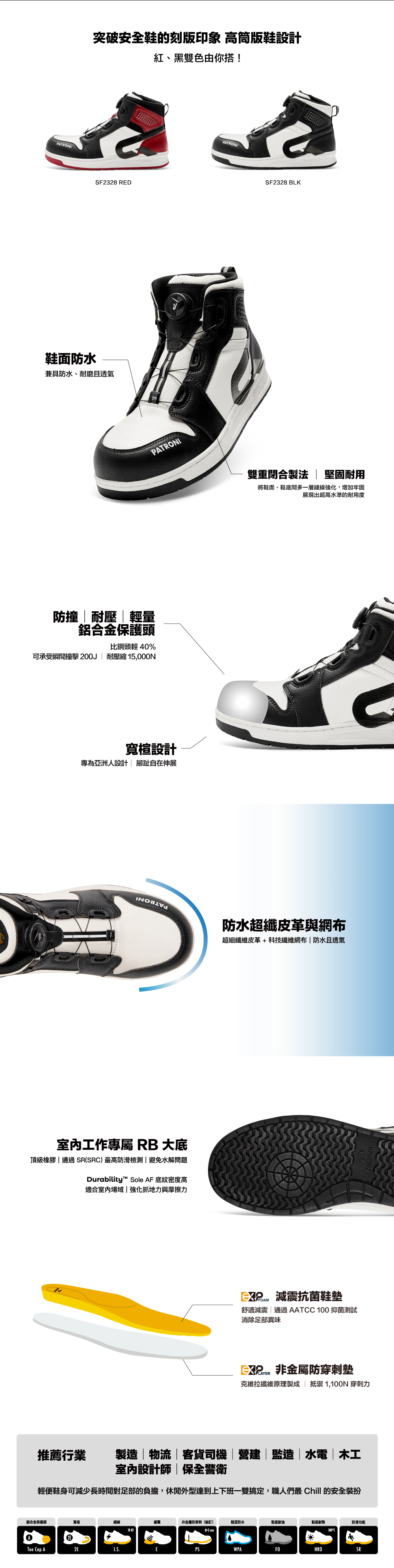 安全等級 SBPS ∣ 200J 鋁合金頭 ∣ 非金屬防穿刺墊(細釘) PS ∣ 防滑 SR(SRC) ∣ 鞋跟緩震 E