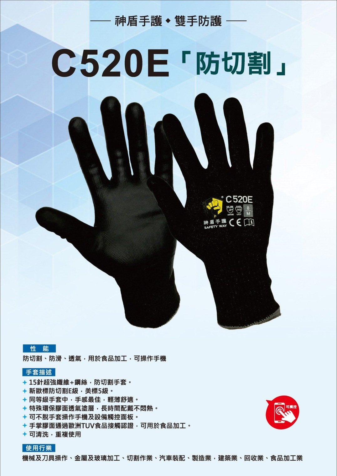 • 可不脫手套操作手機及設備觸控面板