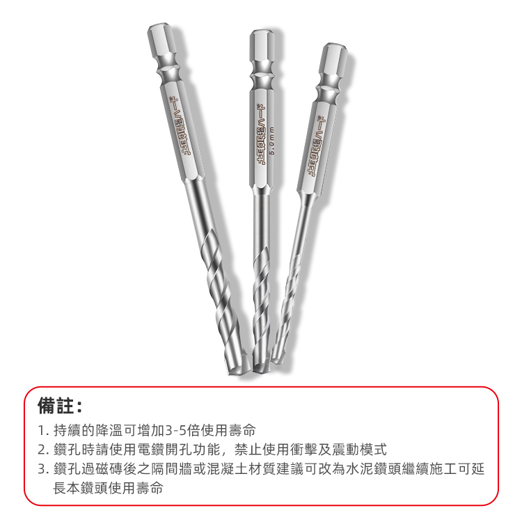 鑽孔過磁磚後之隔間牆或混凝土材質建議可改為水泥鑽頭繼續施工可延長本鑽頭使用壽命