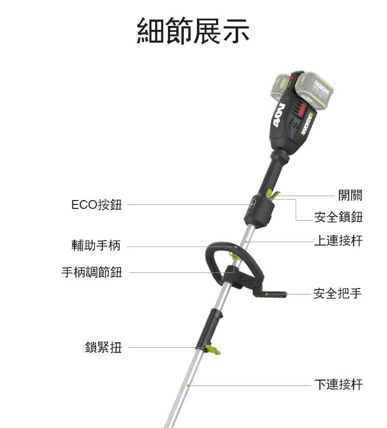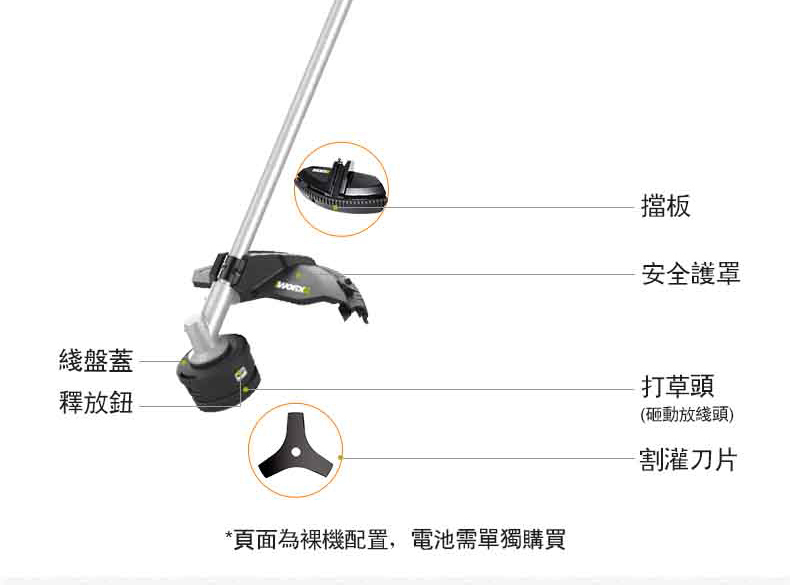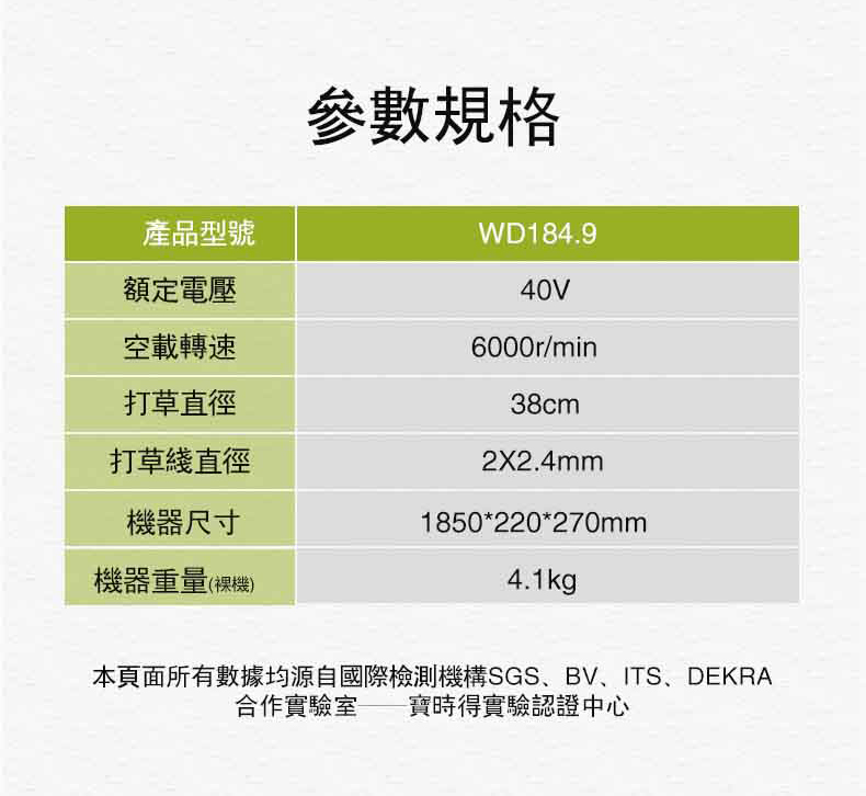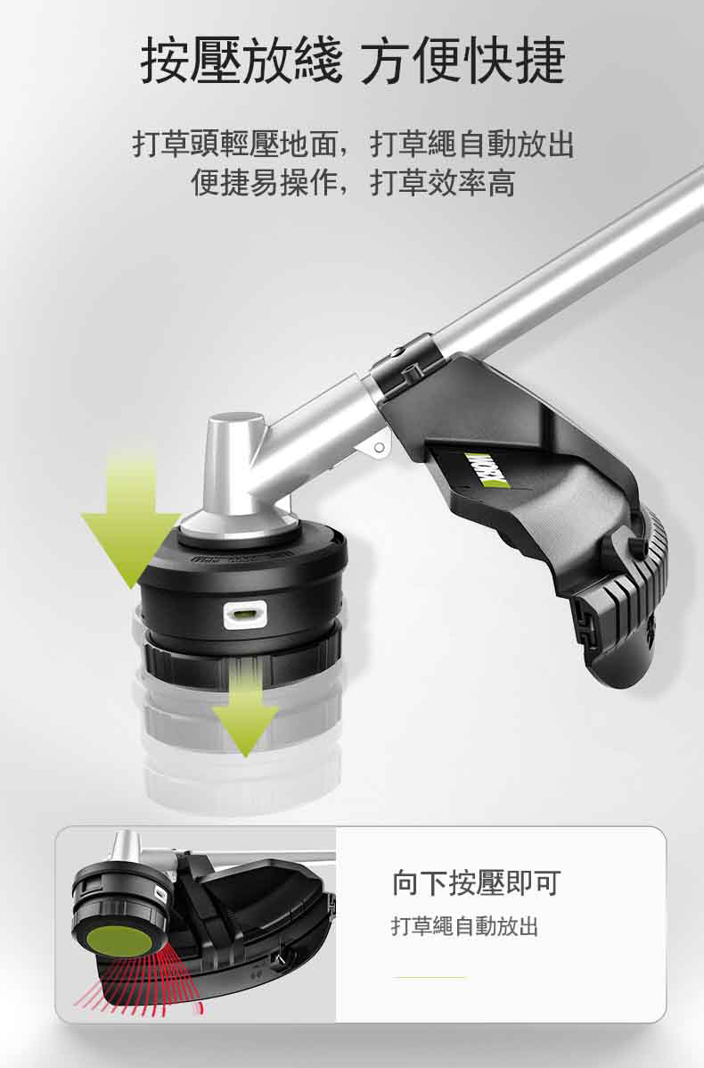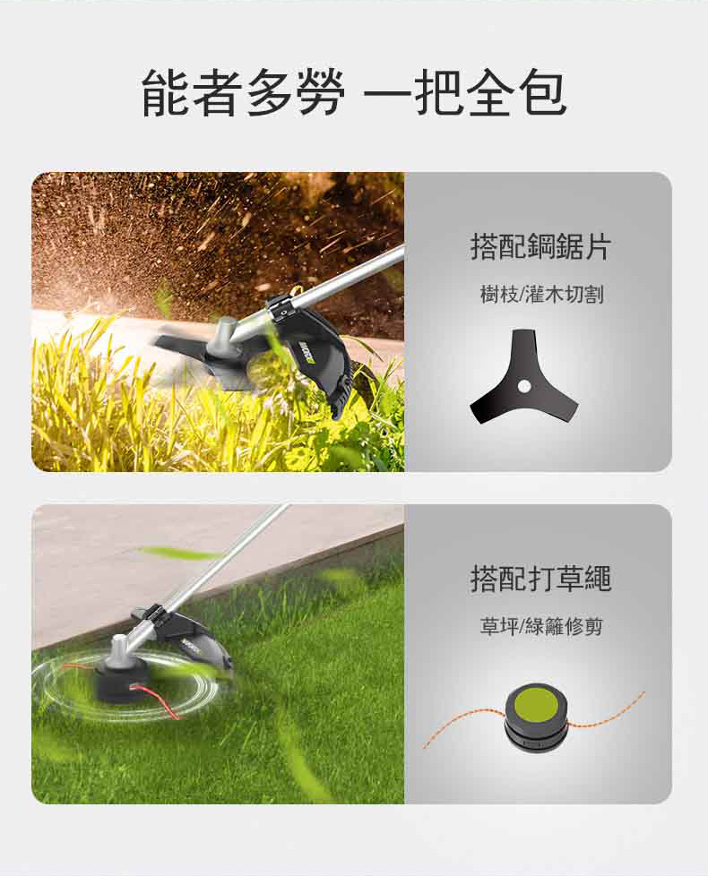 【商品標配】主機x1、內六角扳手x1、套筒x1、4M線盤x1、背帶x1、割灌刀片x1、使用說明書x1、保修卡x1
