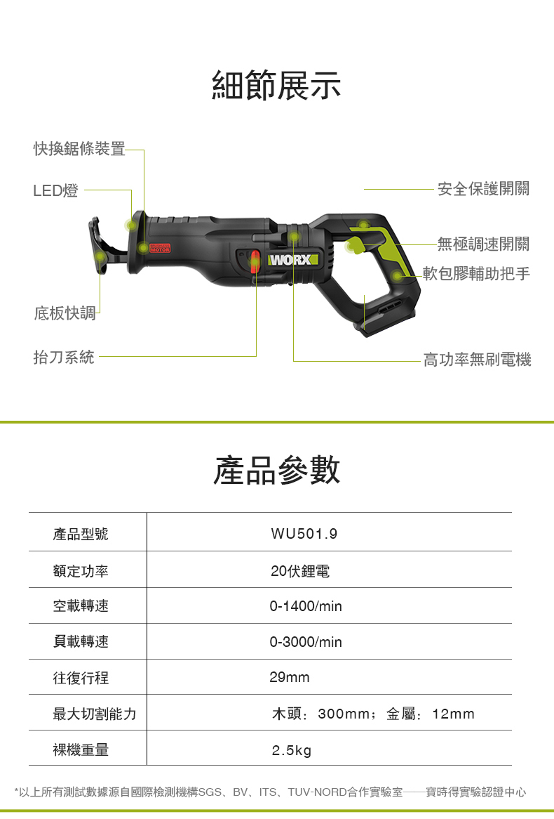 • 最大切割能力:木頭:300mm / 金屬:12mm