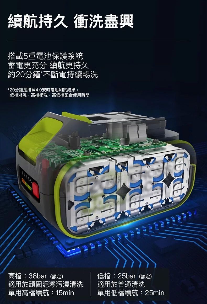 • 高檔38bar適用去除頑固髒汙,低檔25bar適用一般清洗