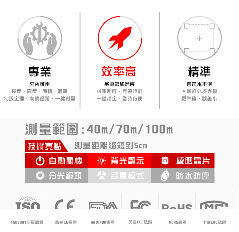 • 最大測量距離:40m / 70m / 100m
