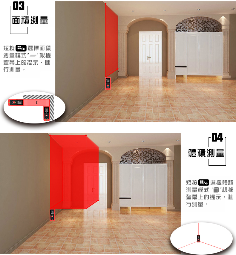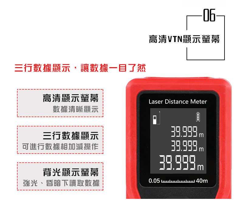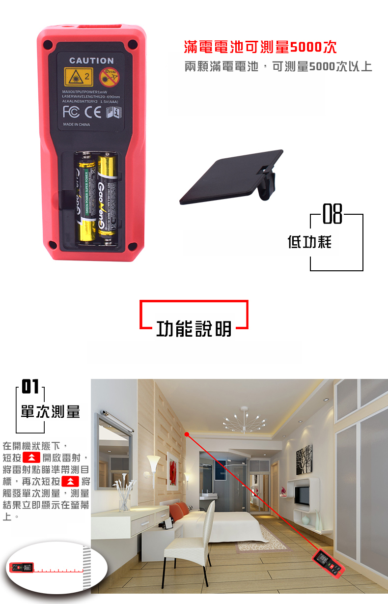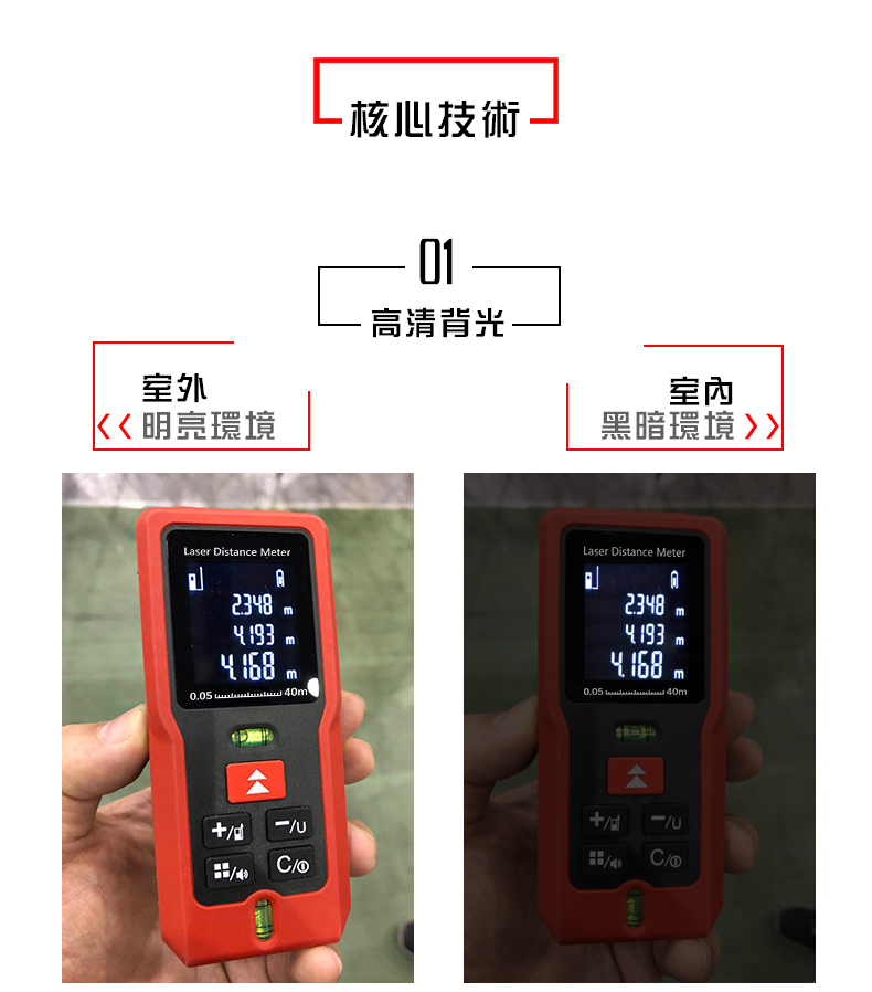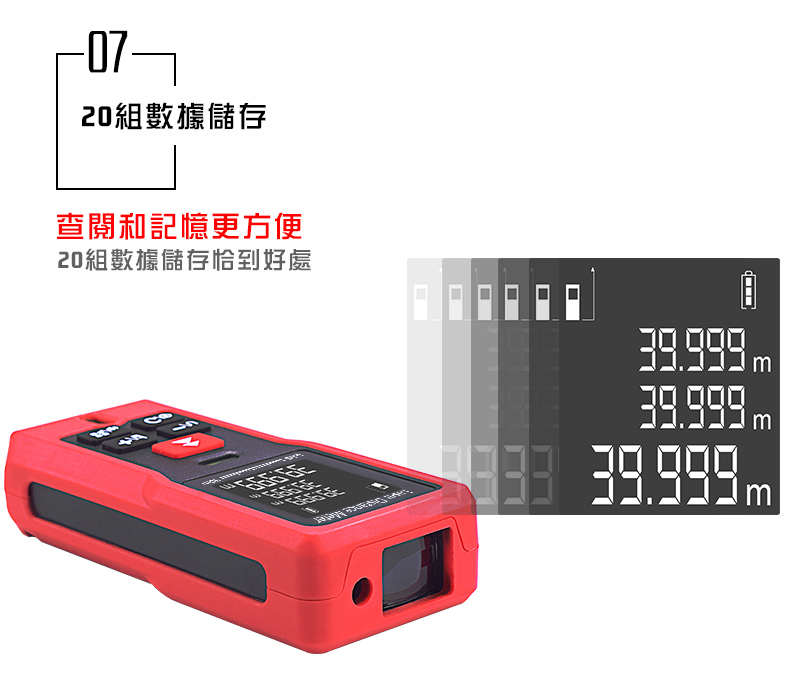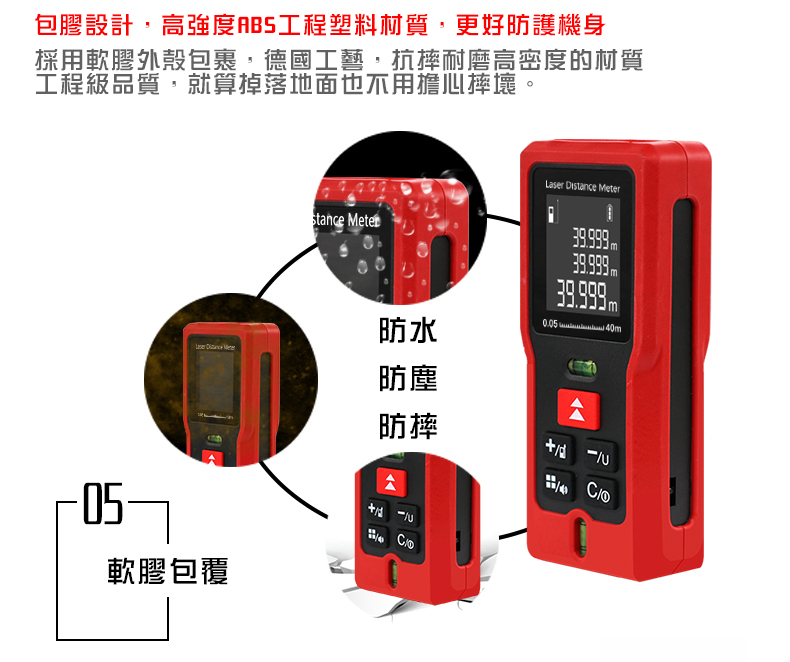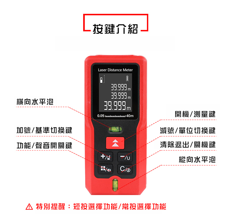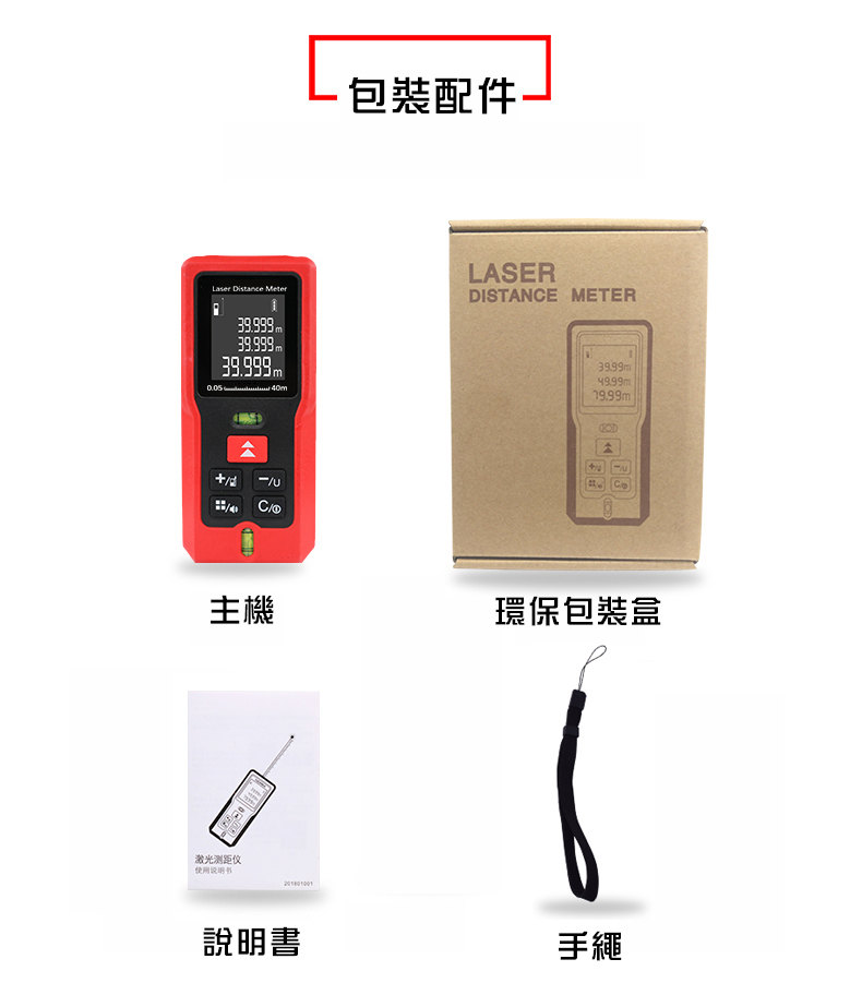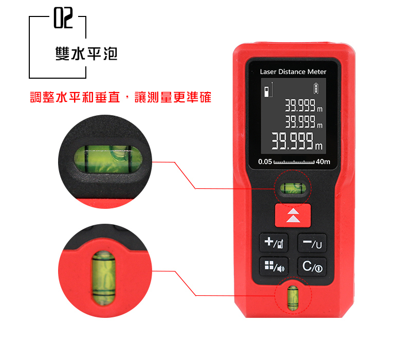 1.核心規格:高清背光,在室內外皆可清晰確認螢幕數據2.雙水平泡:調整水平和垂直,測量更精準3.紅外線發射器:0.25秒快速測量並精準定位4.進口光學鏡頭:清晰透亮,不懼強光5.軟膠包覆:高強度ABS工程塑料材質,防塵、防摔、防水6.高清螢幕顯示:三行數據顯示,背光顯示螢幕7.20組數據儲存:查閱和記憶更方便8.低功耗:滿電電池可測量5000次【商品規格】