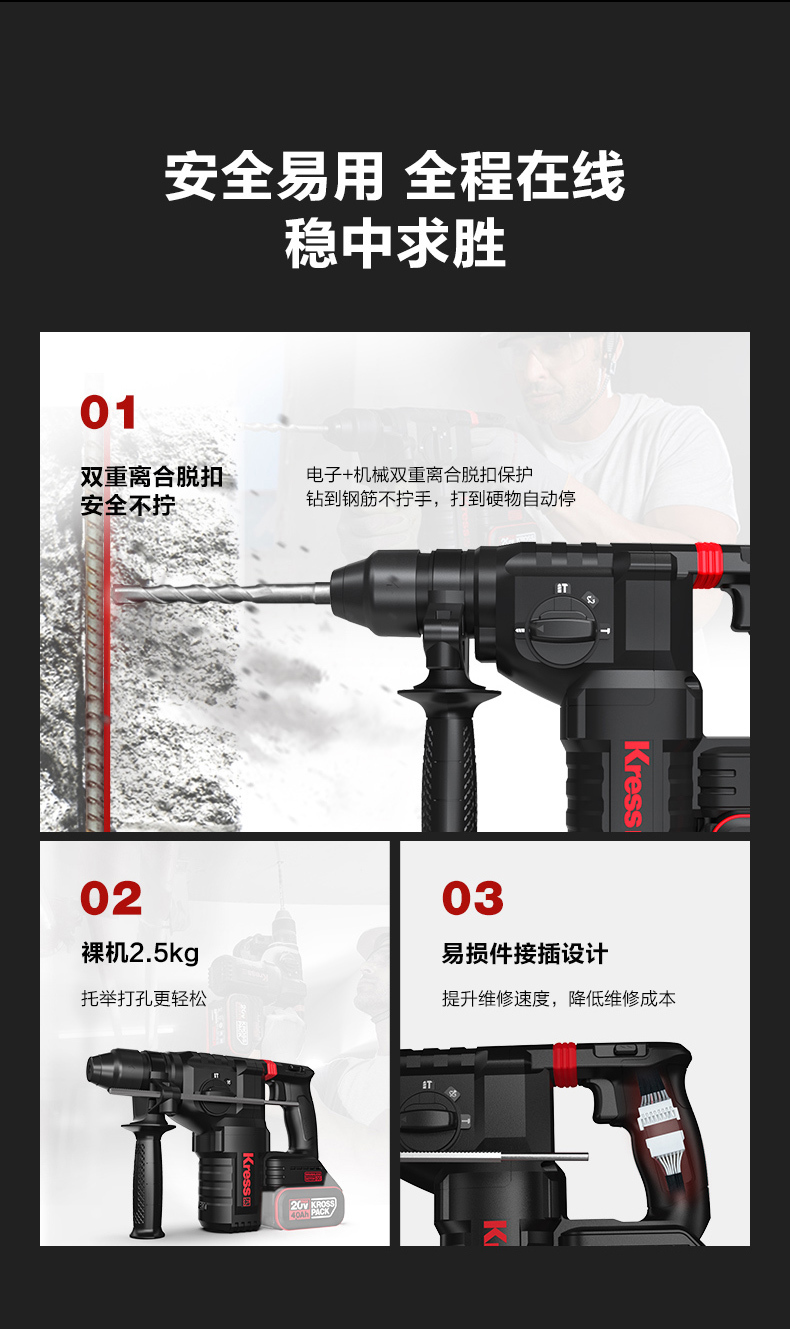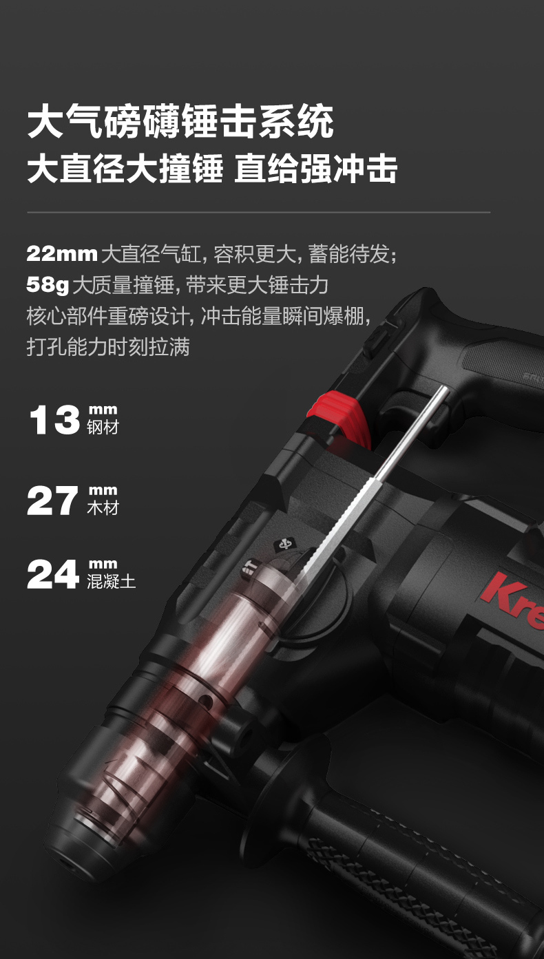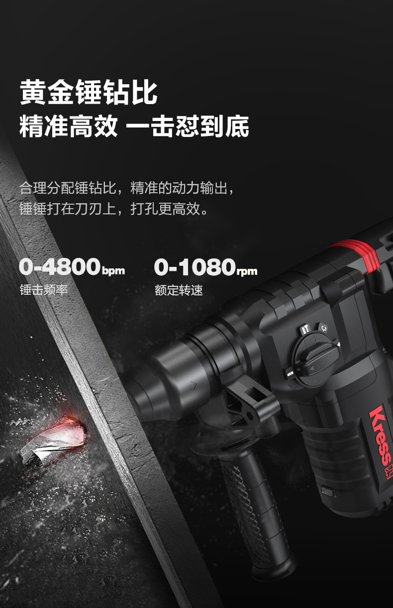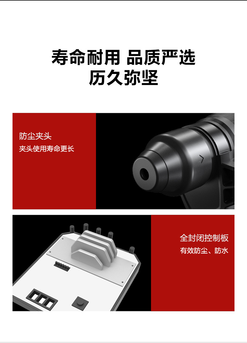 • 四功合一(電鑽、槌鑽、槌擊、調整)