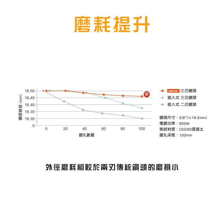 • 特殊合金製成刀頭,三刃特殊設計,耐衝擊,外徑磨耗相較於兩刃傳統鑽頭的磨損小。