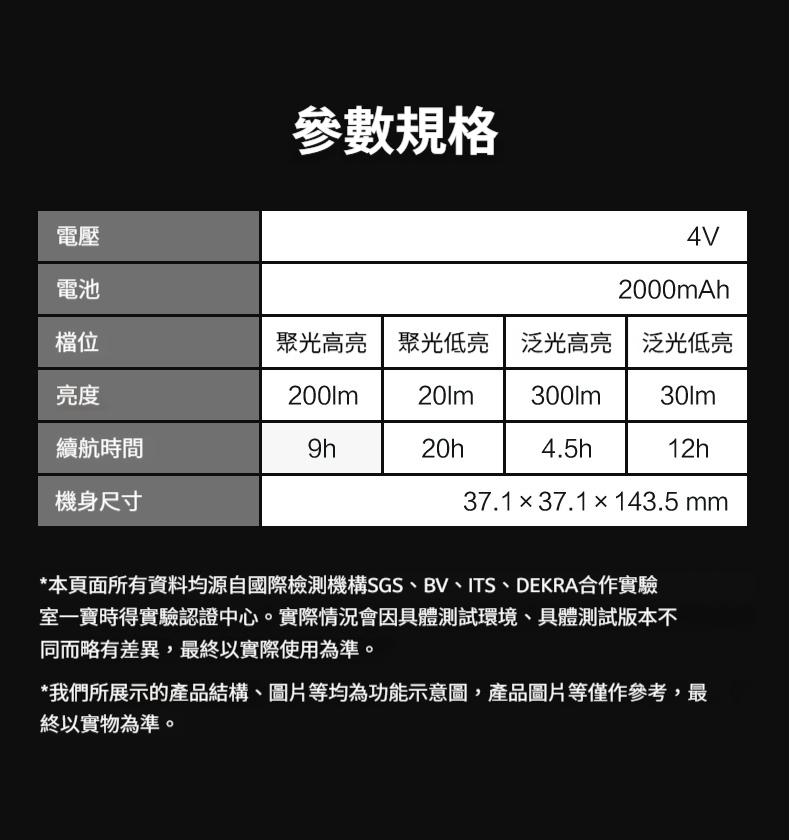 檔位亮度與續航時間: