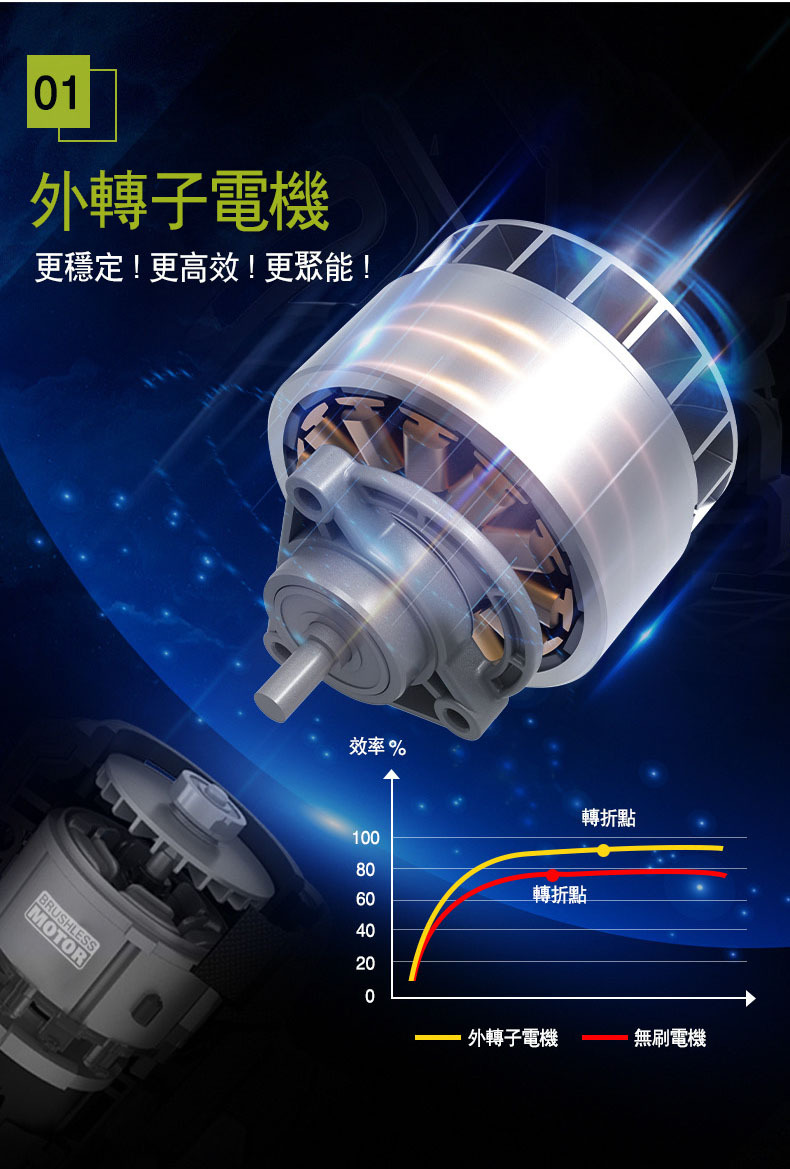 • 無刷外轉子馬達效率更好